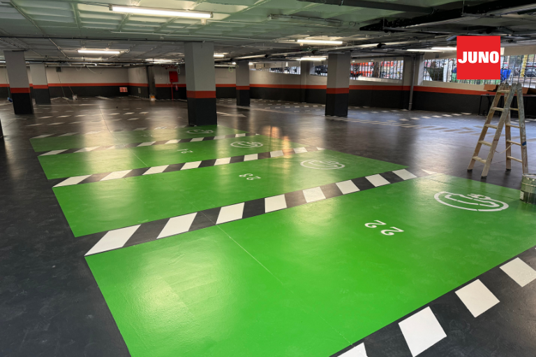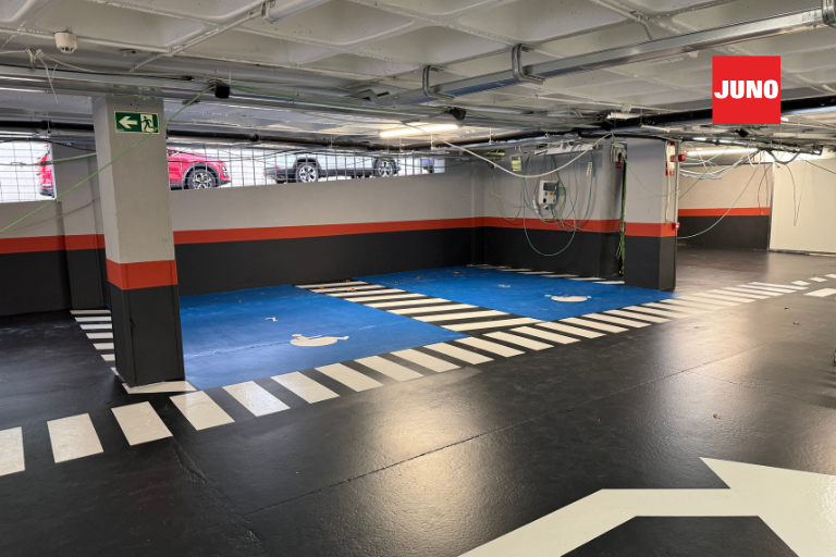 Gracias a este sistema de pintado para pavimentos continuos de Pinturas JUNO, el parking de BM Supermercados en Majadahonda cuenta ahora con un suelo renovado, seguro y visualmente atractivo. Una actuación que combina técnica y estética para prolongar la vida útil de la instalación y mejorar la experiencia de clientes y trabajadores.